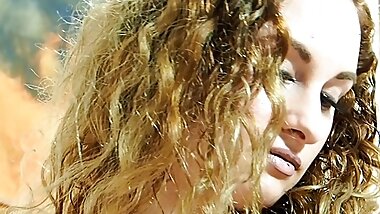 "This horny bitch strips naked, touches her vagina in the dunes and then fingers herself"