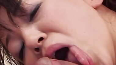 "2 guys eat their crerampie from this Japanese babe"