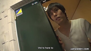 "Japanese babes are sucking their teacher's dick while kneeli"