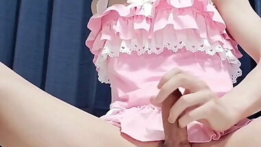 "Japanese crossdresser masturbating in pinky banish dress"