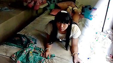 "Dark haired shemale with small boobs loves getting fucked by a hard cock"